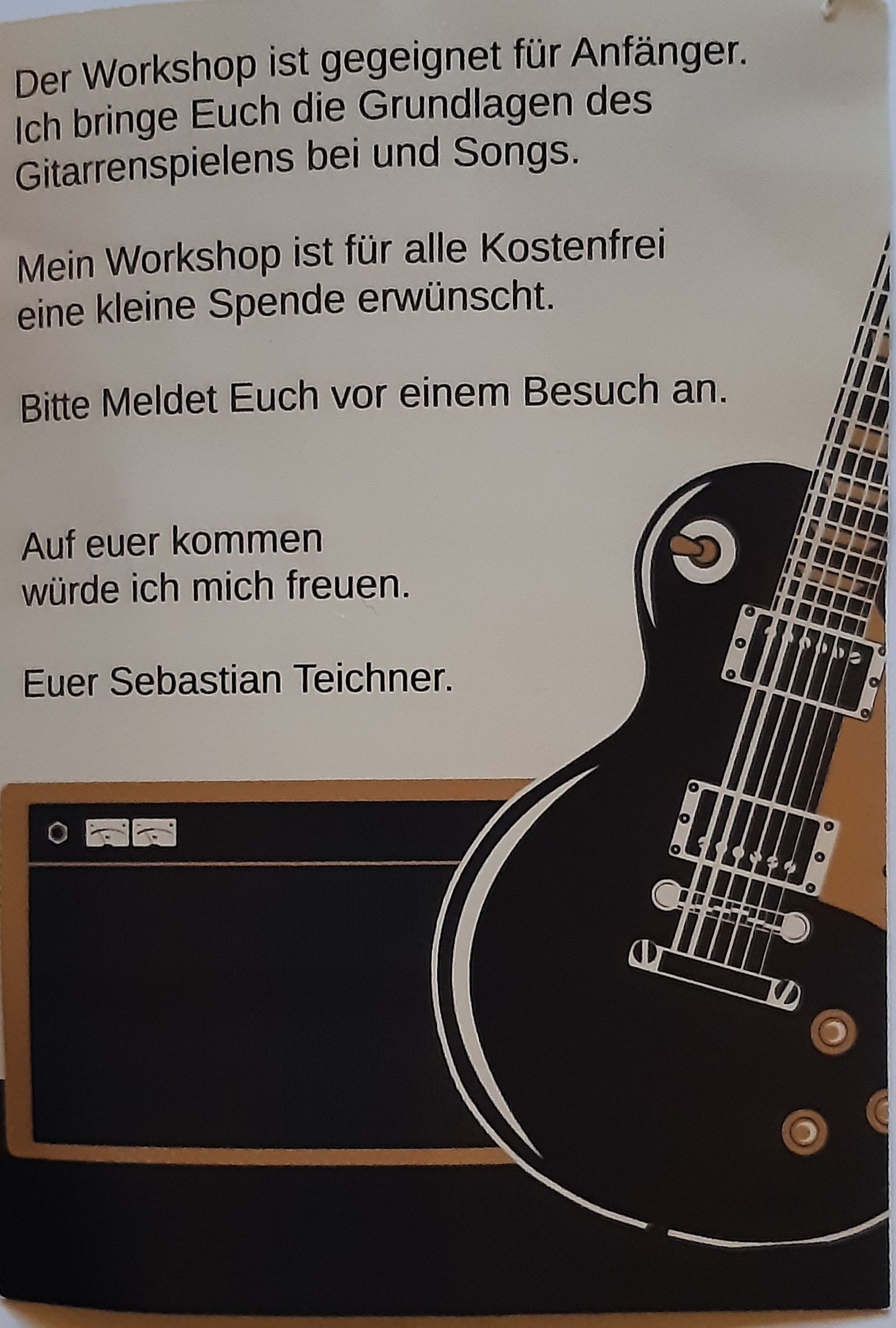 Hallo zusammen ab den 18.Oktober findet der Gitarrenworkshop in Ursberg in der Abteilung Freizeit in der Bücherstube in der Dominikus-Ringeisenstr.1b 86513 Ursberg statt. Sie Erreichen mich täglich von 18:00 bis 20:00 Nummer ist im Whatsapp Symbole. Ab Sofort biete ich Einzel Unterricht bei mir daheim nach Absprache und Anmeldung an.